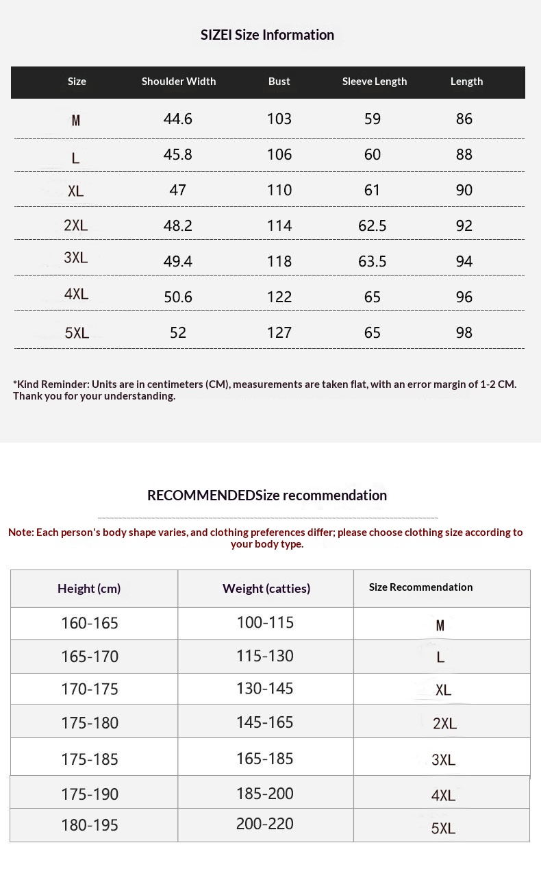 Sizes: 165/M, 170/L, 175/XL, 180/2XL, 185/3XL, 190/4XL, 195/5XL